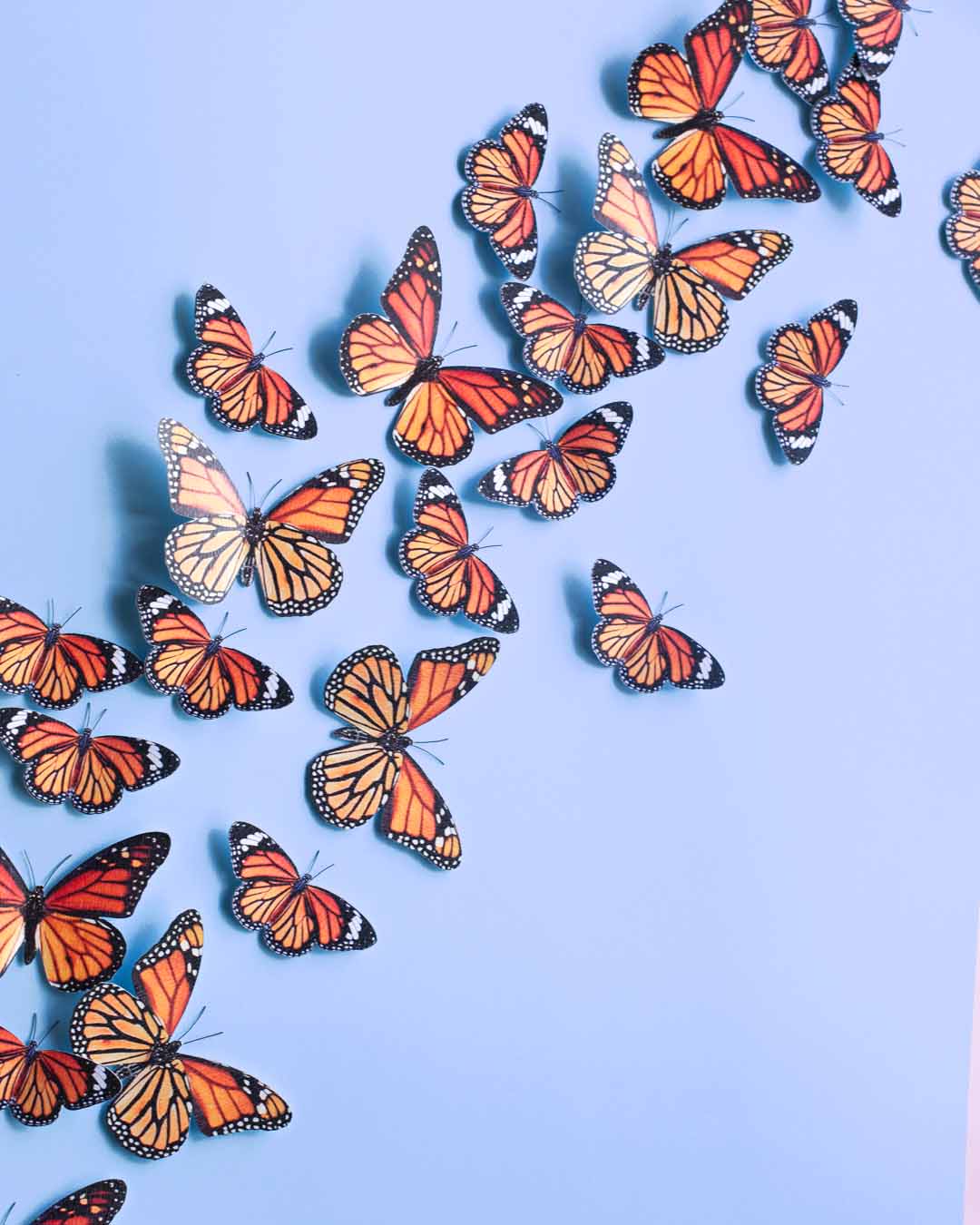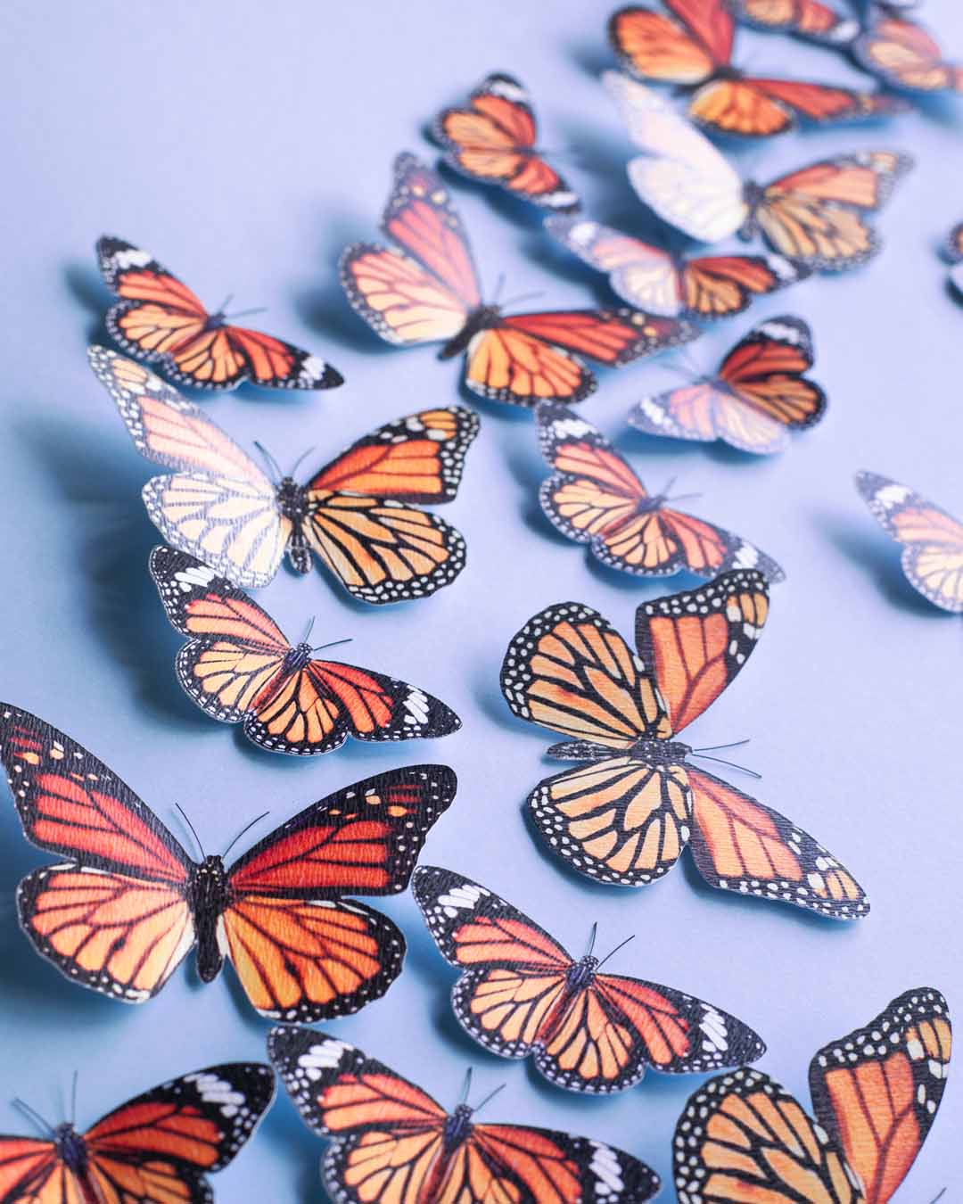 - Set de 24 mariposas Monarcas autoadhesivas, impresas sólo en el frente
